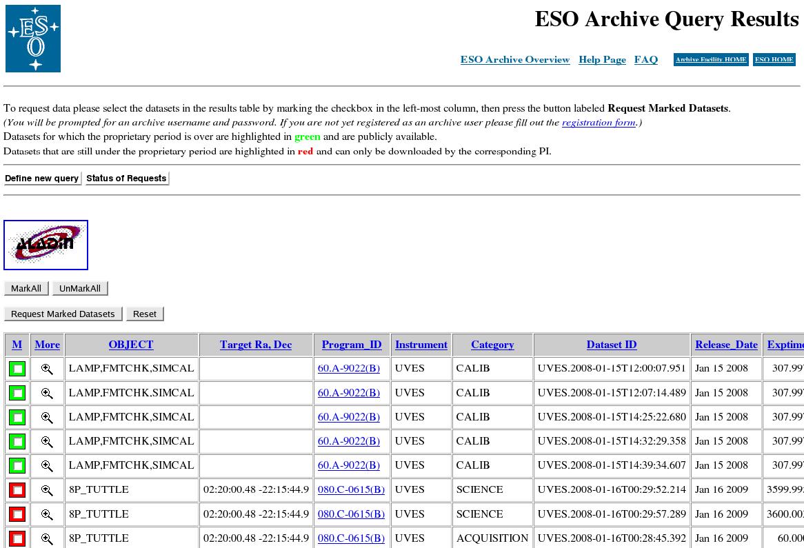 To this end, the archive interfaces have been slightly modified. The two figures below compare the old, familiar version (left panel) to the new one in place as of April 1st (right panel). As it can be seen, in this latter the "Mark" button at the left of the web interface page is now color-coded. A green checkbox means that the data are public to everyone, whereas a red one means that they are still covered by the proprietary period and that only their respective PI will be able to download them. Authentication through the User Portal is required for this latter step.